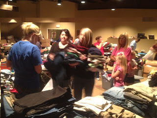We were sent into the clothing room and told to organize the men’s blue jeans. Someone found a roll of duct tape and we wrote sizes on the tables and started sorting. It was a gracefully hurried, no-nonsense atmosphere. No one wasted words or motions. As quickly as we got a stack of jeans built up another person would box it up and label the box with the size. Eventually we ran out of room and started taking the boxes out into the hall when we finished.